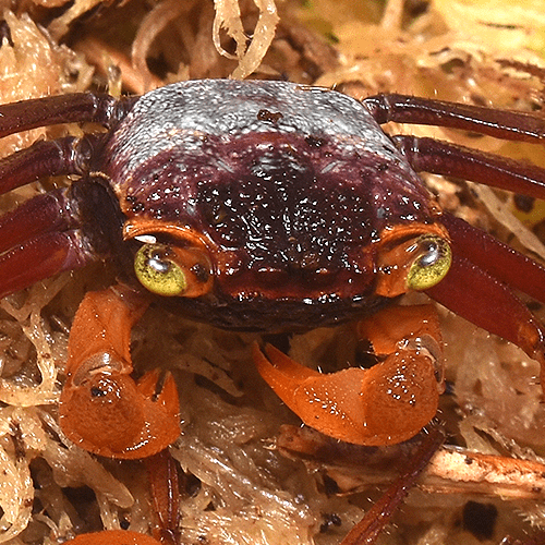 The Vampire Crabs, belonging to the Geosesarma genus, are little crabs originating from Indonesia. They grow up to 20-25mm of shell size and are very colourful. These are a land crab species only returning to fresh water to moult or lay eggs making them perfect Terrarium inhabitants. They love a bioactive set ups to forage through and require access to a pool water.